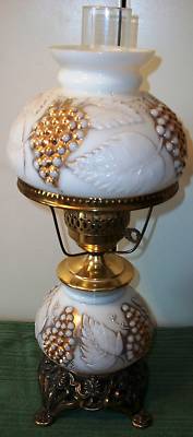 ANTIQUE GOLD BRASS AND RAISED MILK GLASS HURRICANE LAMP