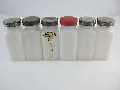 Vintage Set of 6 Griffith's ART DECO Milk Glass Spice Jars Silver Red Lid