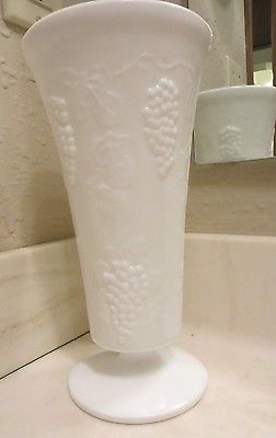 Title (ebay affiliate link): Vintage White Milk Glass Planter Vase with Grapes Pedestal Paneled EUC