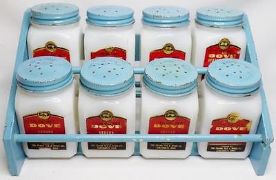 RETRO VINTAGE SET 8 FRANK TEA & SPICE CO MILK GLASS DOVE SPICE SHAKER JAR W/RACK