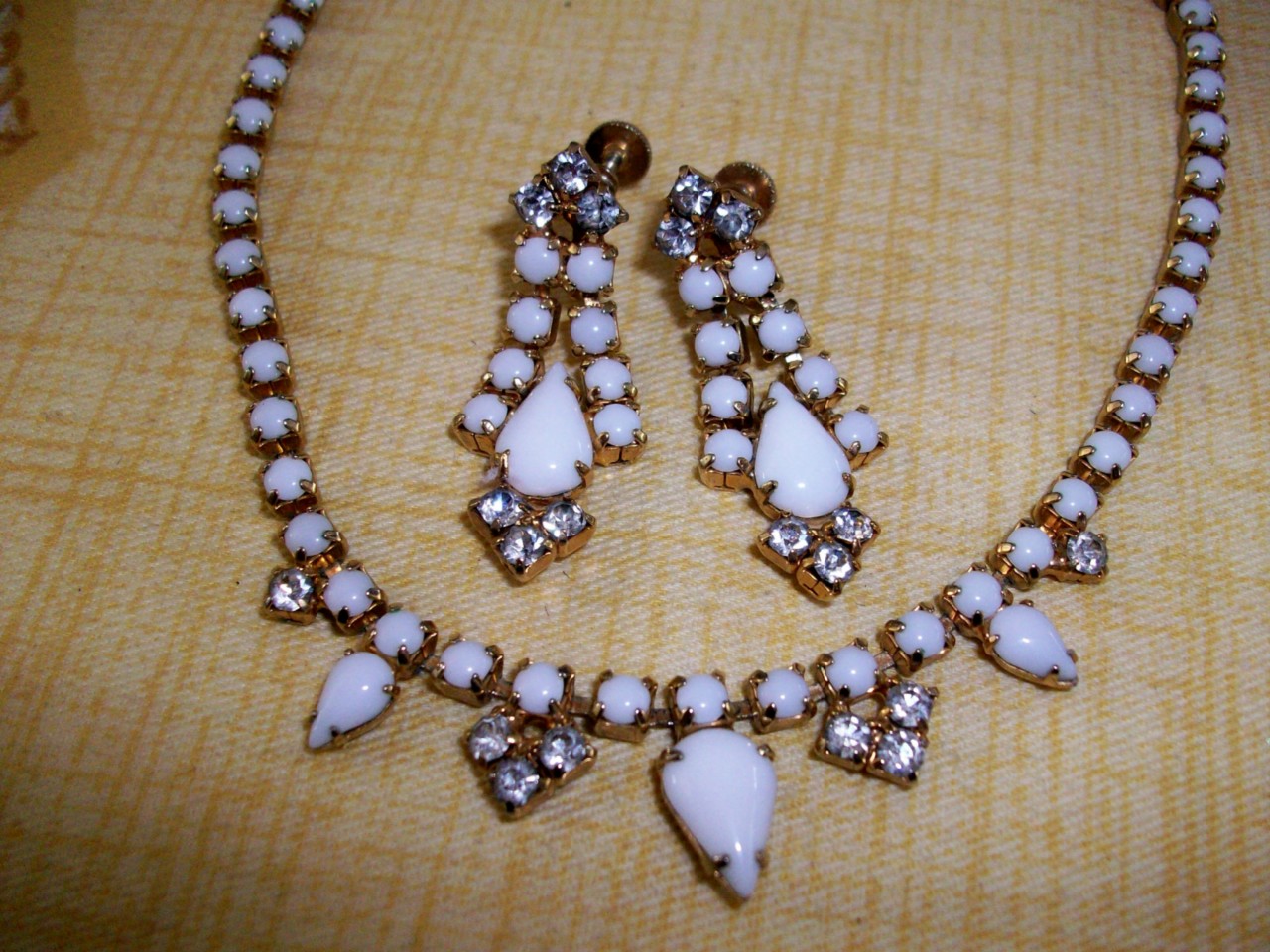 Vintage Milk Glass & Rhinestone Necklace & Earring Set