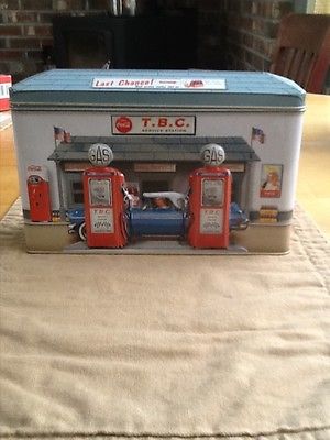 Tin gas station candy box great graphics raised design service pumps coca cola