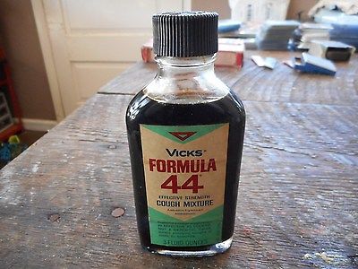 Title (ebay affiliate link): Full Vintage Vicks Formula 44 Cough Mixture Syrup Expectorant Medicine Bottle