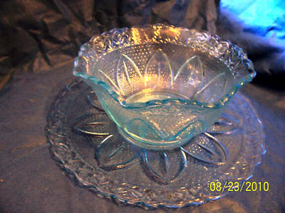 LIGHT SKY BLUE Sandwich Style Deprs Glass Bowl & Plate
