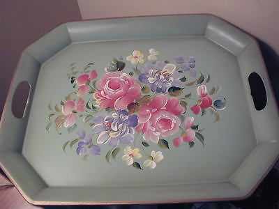 Vintage Nashco Green Hand Painted Floral Metal Toleware TRAY w/org.tag