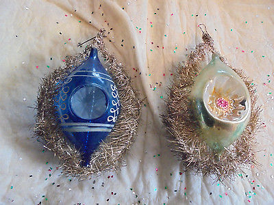 Title (ebay affiliate link): 2 VINTAGE TINSEL ROUNDED OPEN ENDED & TEAR DROP INDENTED GLASS ORNAMENTS
