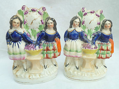 PAIR c.1850 ANTIQUE VICTORIAN STAFFORDSHIRE FIGURINES SCOTTISH GIRLS BY CLOCK