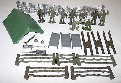 Title (ebay affiliate link): Vintage MPC Army Soldiers Tent Fence Guns Helmets Stretchers Skis Playset Parts