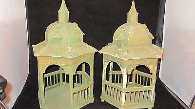 Pair Vintage China Paper Mache Cardboard Gesso Model Gazebos~Green Shabby Paint