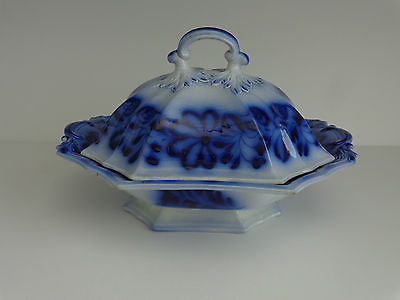 Large Antique English Flow Blue Ironstone China Octagonal COVERED Vegetable Bowl