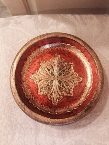 Title (ebay affiliate link): Vintage FLORENTIA Hand Made Wood Dish Italy Florentine Gold Gilt Red Round Bowl
