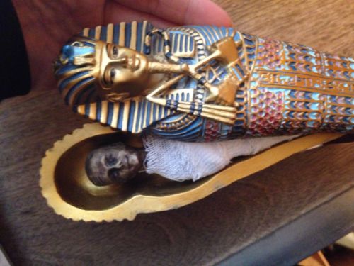 Title (ebay affiliate link): Egyptian resin Pharaoh King TUT Tomb Coffin Mummy With holder & Mummy Inside