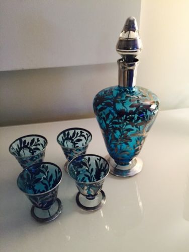 Antique Blue Glass Decanter And Shot Glasses With Silver Overlay