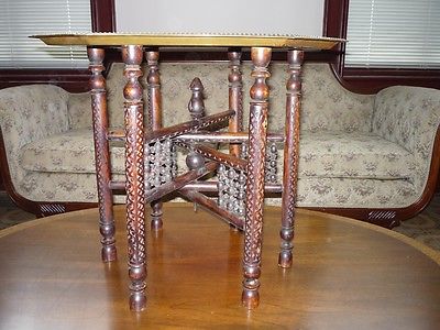 Antique Large Engraved Brass Tray with Six Leg Folding Stand
