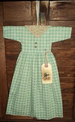 GRUNGY~PRIMITIVE WALL~CUPBOARD~DOLL DRESS GREEN CHECK EASTER FOLK ART DECOR