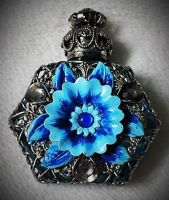 Vintage Czech Glass Mini Perfume Bottle~Blue/Silver~Blue Flower~Crystals USA