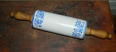 ANTIQUE BLUE & WHITE SALT GLAZED WILD FLOWER ROLLING PIN WOOD HANDLE