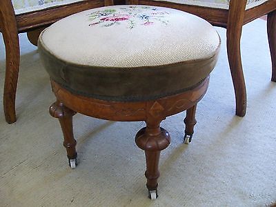 ANTIQUE EASTLAKE WALNUT WOOD NEEDLEPOINT VELVET FOOT STOOL CHINA CASTORS ORNATE