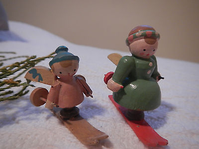 Title (ebay affiliate link): 2 OLD Miniature Angels on Skies Painted Wood Christmas Decorations Ornaments