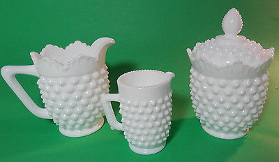 Title (ebay affiliate link): White Milk Glass Hobnail Creamer & Sugar Bowl Set Mini Pitcher Toothpick Holder