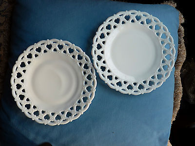 Two milk glass 8" plates with floral lattice border edge in Very Good Condition