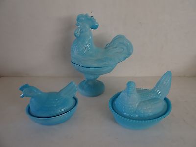 Set of 3 Vintage Hen-on-Nest and Rooster Light Blue Milk Glass