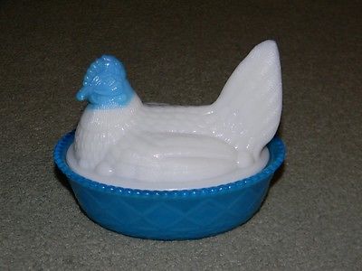 Title (ebay affiliate link): VTG Westmoreland Blue White Milk GLASS Hen on Nest Basket Weave Candy Dish Bowl