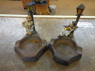 Pair Antique Cast Iron Drunk Man & Woman w/rolling pin, Lamp Post Ashtrays 1930s