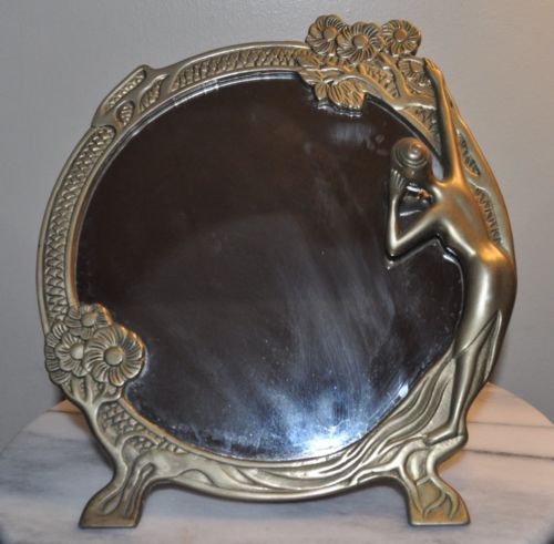 Vintage Art Deco Noveau Vanity Mirror Brass Frame Figural Woman