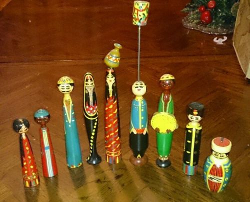 9 Egyptian hand painted wood turned folk art 1970s dolls