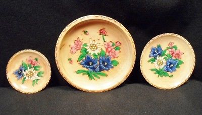 Vtg Set of 3 Tole Ware Wooden Floral Wall Plates Americana Scandinavian Folk Art