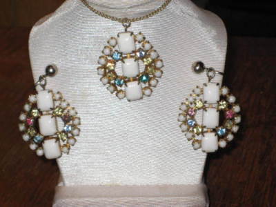 Vintage Milk Glass & Rhinestone Necklace & Earring Set