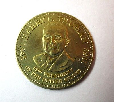Title (ebay affiliate link): Vintage Harry S. Truman 33rd President of the USA Goldtone Metal Coin Token