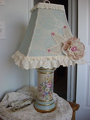 Title (ebay affiliate link): Antique Victorian Shabby Porcelain Lamp - Crocheted Shade Hand Painted Roses