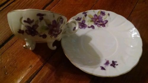 Vintage tea cup and saucer with purple flowers and gold trim