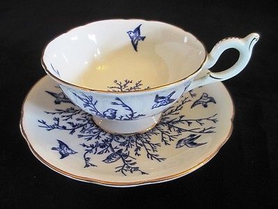 c1950s Coalport Blue Twigs & Birds On Rim, Scalloped Tea Cup and Saucer No. 8365