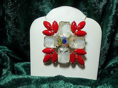Square Vintage Pin With Red Milk Glass, Borealis and White Art Glass Rhinestones