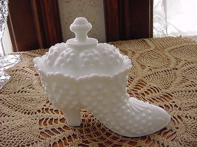 Title (ebay affiliate link): VTG WHITE FENTON HOBNAIL MILKGLASS OLD SHOE CANDY DISH LID MARKED ON BOTH PIECES