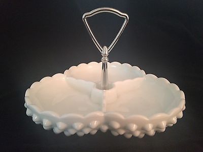 Vintage Fenton Milk Glass Hobnail Chrome Handled Relish Dish