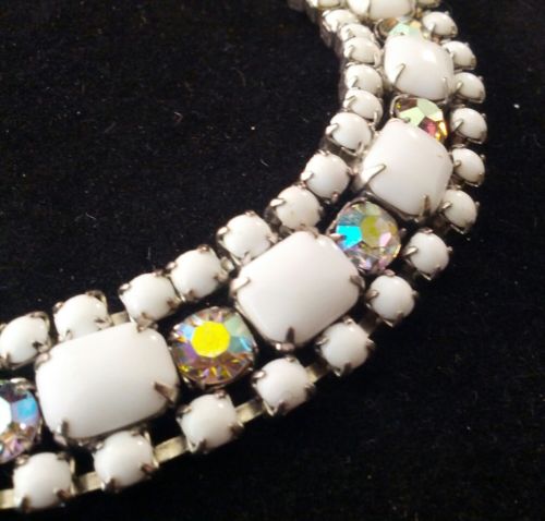 Title (ebay affiliate link): Vintage Bracelet Aurora Borealis AB Rhinestone Milk Glass Silver Tn PRETTY! 1074