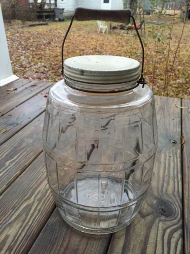 Title (ebay affiliate link): Vtg Clear Pickle Jar/Jug Glass Barrel Design w/Metal Cover & Handle Primitive