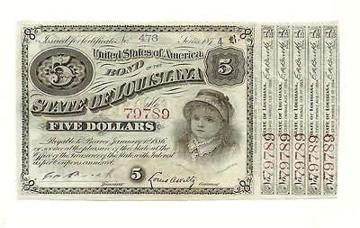 Title (ebay affiliate link): Post-Civil War $5.00 State of Louisiana "BABY BOND" 1870s