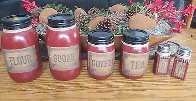 Title (ebay affiliate link): PRIMITIVE MASON JAR CANISTER SET OF 6! BARN RED WITH JUTE AND PRIM LABEL!