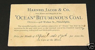 1884 Coal Mining Ad & Price Postcard, Philadelphia PA, Ocean Bituminous Coal