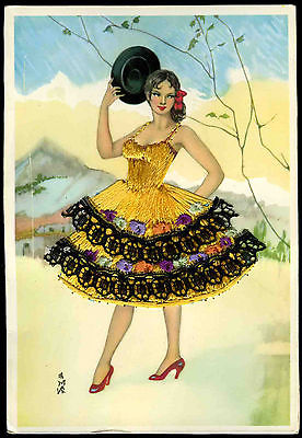 Vintage 1970's Postcard Embroidered Silk Spanish Dancer Woman in yellow dress