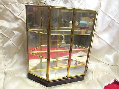Vintage Brass & Glass Wall Hanging Mirror Curio Cabinet with Wood Base * Nice !!