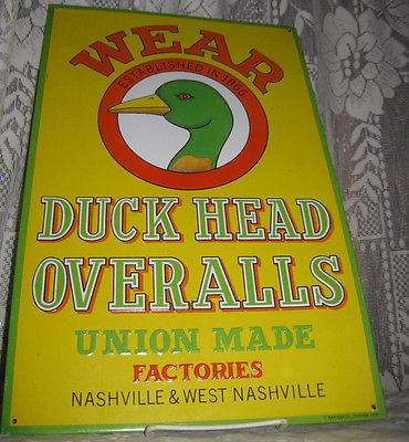 Title (ebay affiliate link): **DUCK HEAD OVERALLS EMBOSSED TIN METAL SIGN** Union Made Jeans Nashville TN
