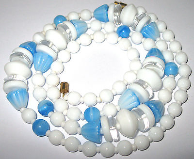 Pretty VINTAGE 1950's MARBLED BLUE VENETIAN WHITE MILK GLASS BEAD LONG NECKLACE