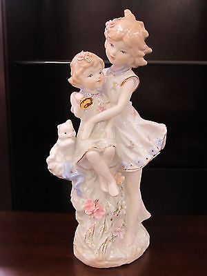 Porcelain Two Girls Sisters Figurine with Cat Hand Painted Beautiful Flowers