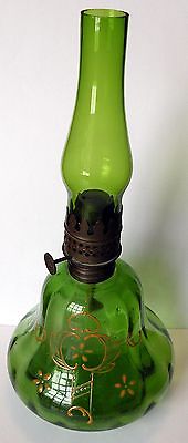 Title (ebay affiliate link): ANTIQUE OIL LAMP EMERALD GREEN W/ CHIMNEY ENAMEL FLORAL P & A MFG. MINIATURE